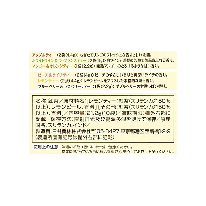 원재료:●애플 티:홍차(스리랑카산50%이상)고, 향료 ●화이트 와인&러프 랭스 티:홍차(스리랑카산50%이상)고, 향료 ●망고&오렌지 티:홍차(스리랑카산50%이상)고, 향료 ●피치&여지 티:홍차(스리랑카산50%이상)고, 향료 ●레몬티《―》:홍차(스리랑카산50%이상)고, 레몬 pea《루》,향료 ●블루베리&《라즈베리티》:홍차(스리랑카산50%이상)고, 향료