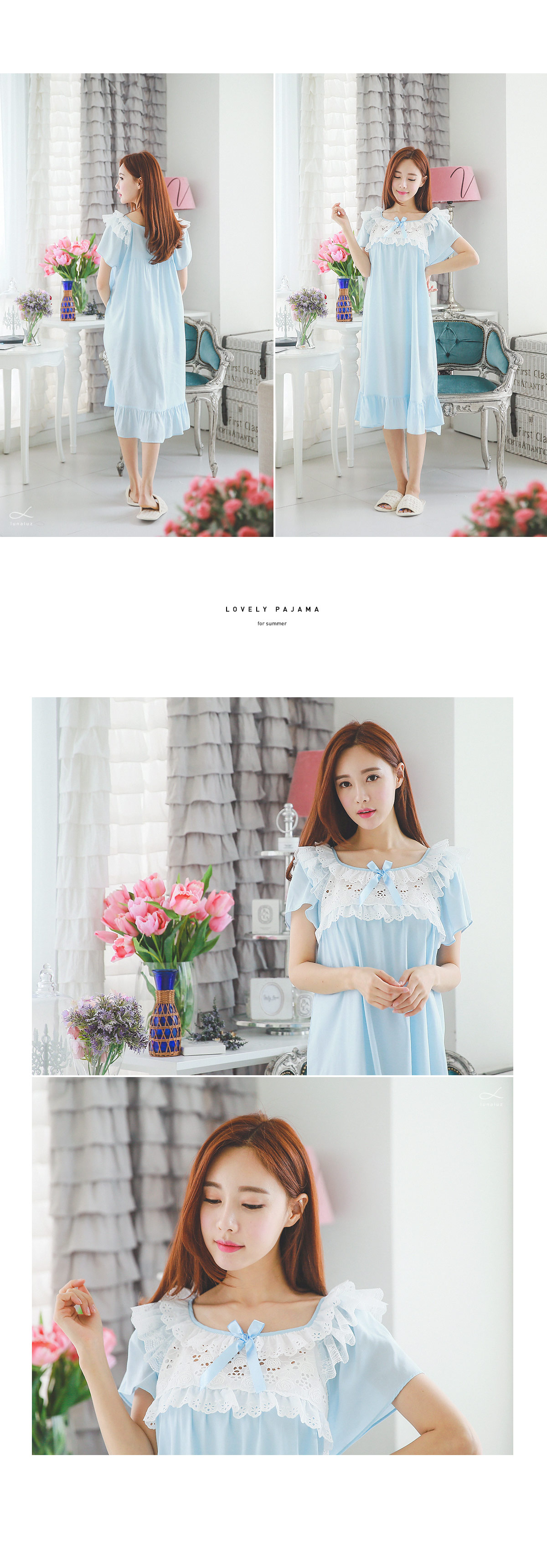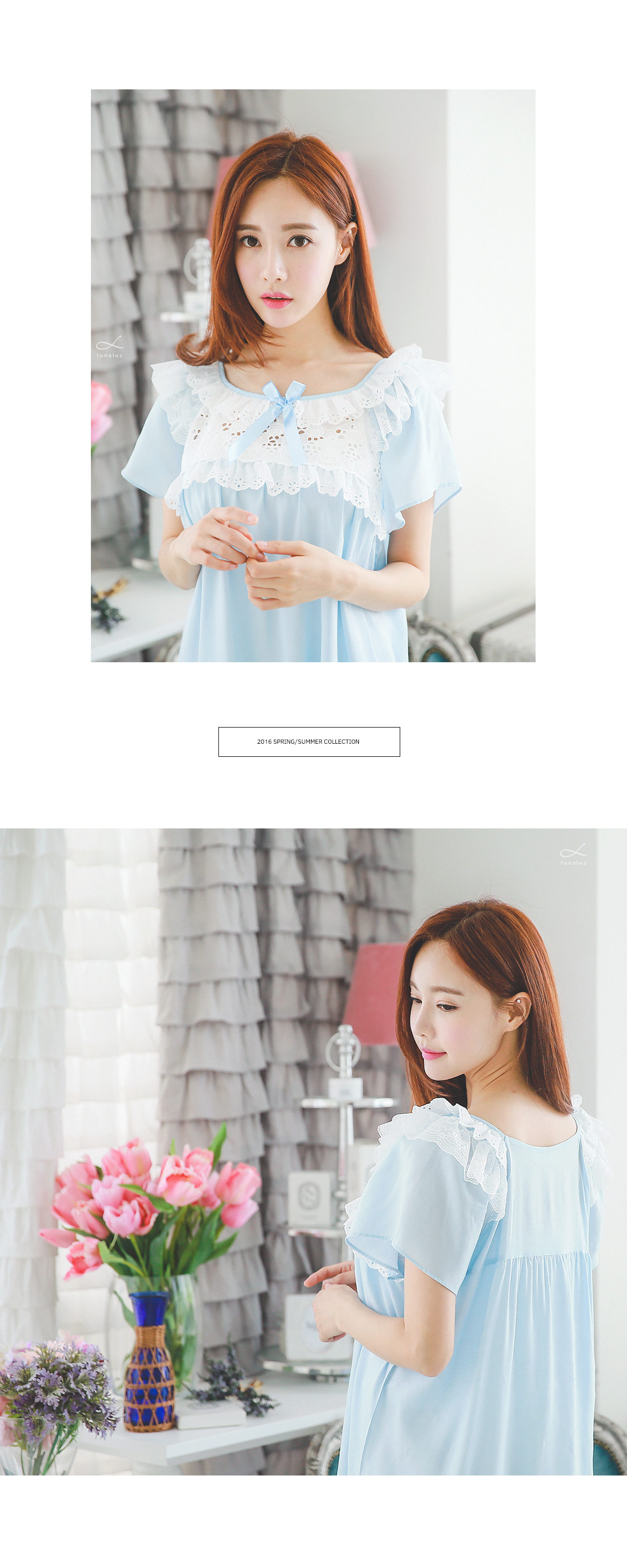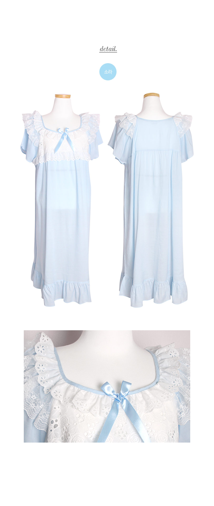 여리한 스퀘어 네크 라인이 쇄골 라인을 내어주며 날씬해 보이면서 여성스러운 느낌을 자아내는데요. 저희 기존 사브리나 패턴을 응용하여 어깨선이 없는 래글런 패턴의 반소매 잠옷으로 제작해 보았어요. 네크 라인에 화이트 면 레이스 장식을 달아주고 바스트 윗 부분에도 레이스 장식을 달아주어 사랑스러움을 더해주었고요. 쉬폰 망사 레이스를 네크의 면 레이스 밑으로 2중으로 달아주어 고급스러운 분위기를 연출하실 수 있어요 : ) 가슴 부분에 오로바 면 레이스를 넓게 달아주어 포인트를 주었습니다. 고급스러우면서 깨끗한 느낌을 주는 잠옷으로 청순하면서 페미닌한 분위기를 느끼실 수 있을 거에요. 가운데에는 블루 컬러의 리본을 달아주어 화사한 분위기를 더욱 UP해주었습니다. 원단은 레이온 원단으로 제작하여 피부에 닿는 느낌이 시원하고, 상쾌 하여 숙면을 취하시기 좋습니다.^^ 낙낙한 품으로 제작하여 66 반까지 커버 가능합니다.^^ 레이온의 찰랑거림 보다는 면 같은 느낌이지만 cool한 느낌이 감도는 잠옷으로 활용도가 좋아요~ 컬러는 청순해보이는 화이트 컬러, 시원해보이는 소라색 컬러로 구성해 보았습니다. 100% 국내 제작으로 내구성은 높여주고, 퀄리티 있는 원단으로 초이스 하여 제작한 잠옷입니다.^^