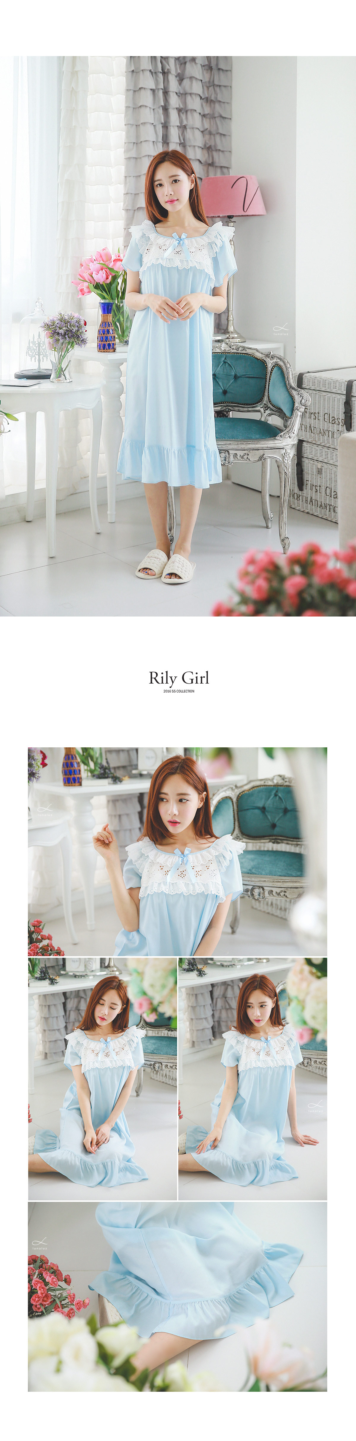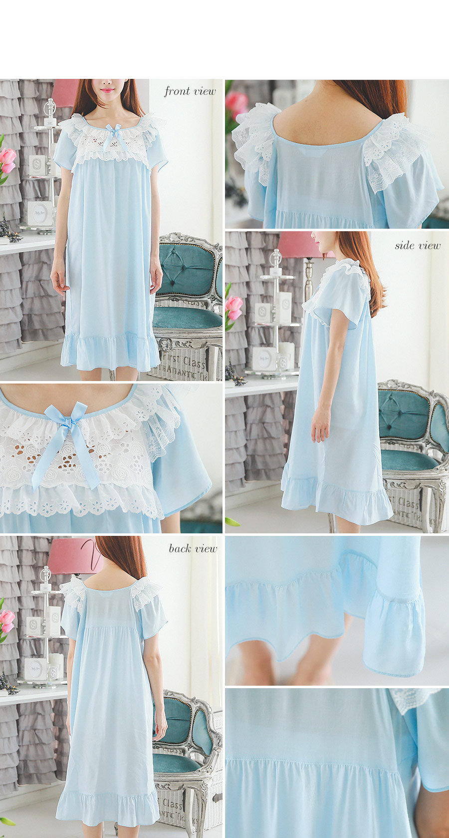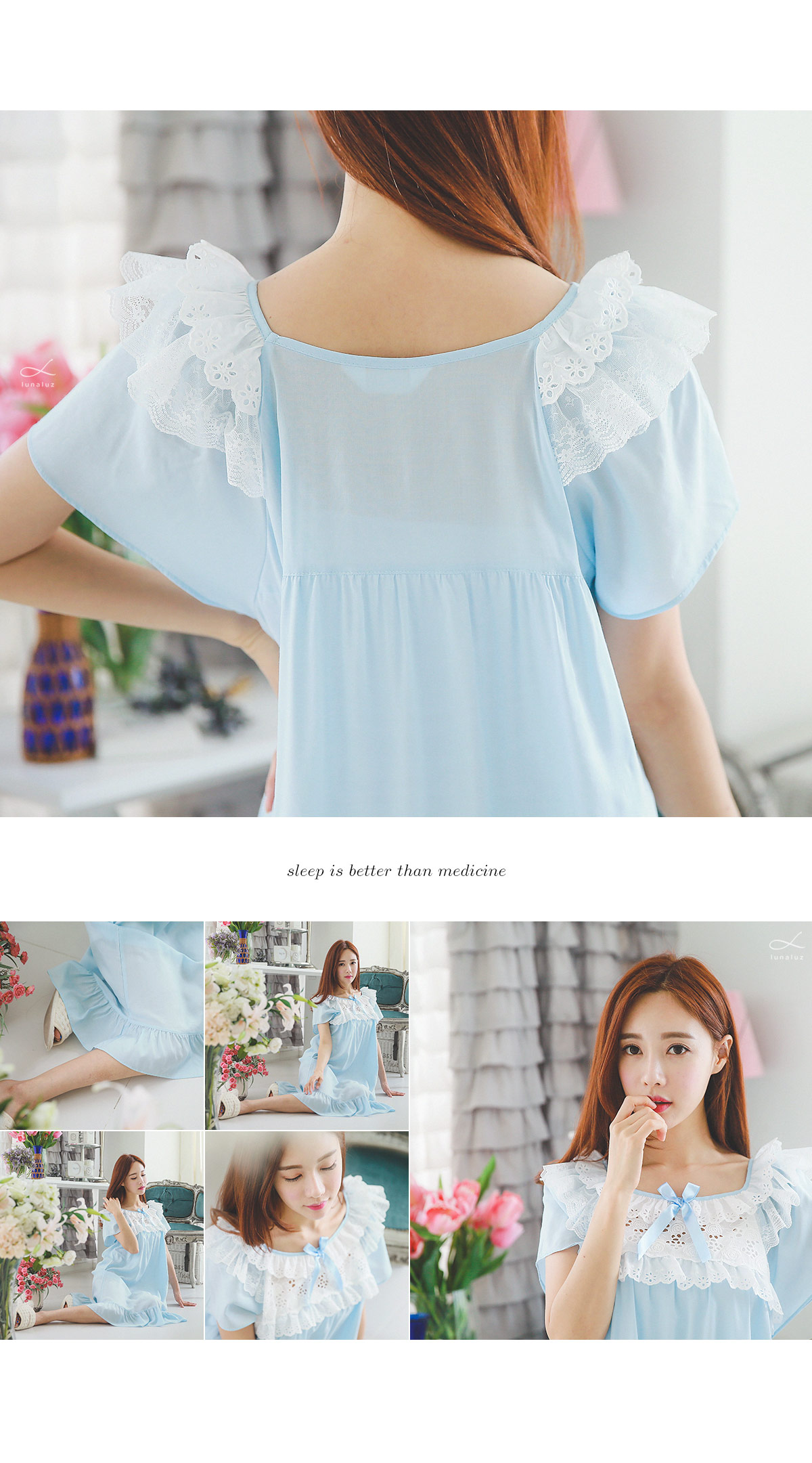여리한 스퀘어 네크 라인이 쇄골 라인을 내어주며 날씬해 보이면서 여성스러운 느낌을 자아내는데요. 저희 기존 사브리나 패턴을 응용하여 어깨선이 없는 래글런 패턴의 반소매 잠옷으로 제작해 보았어요. 네크 라인에 화이트 면 레이스 장식을 달아주고 바스트 윗 부분에도 레이스 장식을 달아주어 사랑스러움을 더해주었고요. 쉬폰 망사 레이스를 네크의 면 레이스 밑으로 2중으로 달아주어 고급스러운 분위기를 연출하실 수 있어요 : ) 가슴 부분에 오로바 면 레이스를 넓게 달아주어 포인트를 주었습니다. 고급스러우면서 깨끗한 느낌을 주는 잠옷으로 청순하면서 페미닌한 분위기를 느끼실 수 있을 거에요. 가운데에는 블루 컬러의 리본을 달아주어 화사한 분위기를 더욱 UP해주었습니다. 원단은 레이온 원단으로 제작하여 피부에 닿는 느낌이 시원하고, 상쾌 하여 숙면을 취하시기 좋습니다.^^ 낙낙한 품으로 제작하여 66 반까지 커버 가능합니다.^^ 레이온의 찰랑거림 보다는 면 같은 느낌이지만 cool한 느낌이 감도는 잠옷으로 활용도가 좋아요~ 컬러는 청순해보이는 화이트 컬러, 시원해보이는 소라색 컬러로 구성해 보았습니다. 100% 국내 제작으로 내구성은 높여주고, 퀄리티 있는 원단으로 초이스 하여 제작한 잠옷입니다.^^
