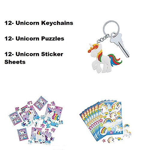 - 36 Piece - Unicorn Party Favor Set - 12 Mini Puzzles, 12 Sticker Sheets, 12 Key Chains - New in sealed packages.