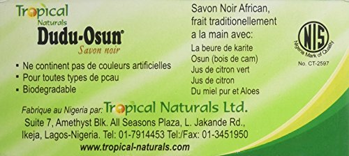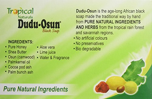 Specially formulated entirely from natural ingredients and herbs, this soap will have you feeling refreshed and silky smooth. Dudu-Osun Black Soap restores damaged skin and is helpful in healing chronic eczema, acne, freckles, and dark spot. Scented with Osun (camwood extract), citrus juices, native honey, Aloe Vera, and natural vitamins.Weight: 150 grams per bar.Made in Nigeria.Ingredients:Pure honey, Shea butter, OSUN (camwood), Potassium Palmkernelate, Sodium Palm Kernelate, Glycerin, Aloe vera, Lime juice, Lemon juice, Water and Fragrance.