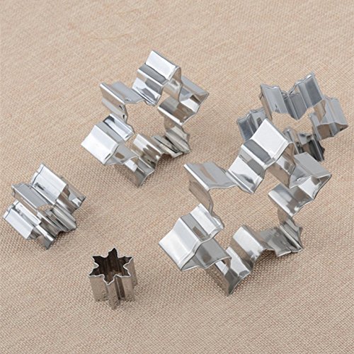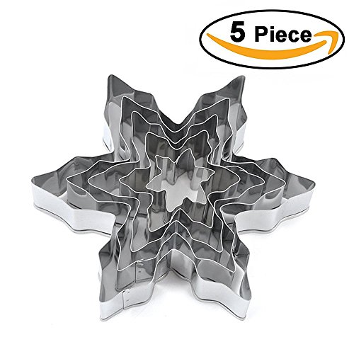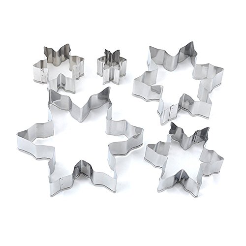 Includes five different sizes: set of 5, snowflake shaped cutters, wide: 4.7"/ 3.7"/ 3"/ 2.4"/ 1.8", height:0.7".