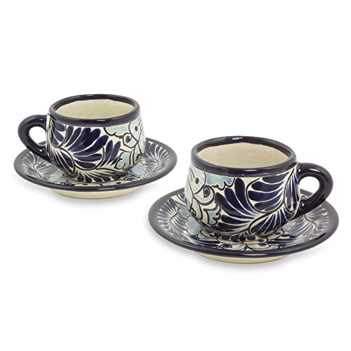 NOVICA Hand Blown Blue Ceramic Floral Cups & Saucers, 8 oz. 'Blue Colonial Blossom' (set for 2)