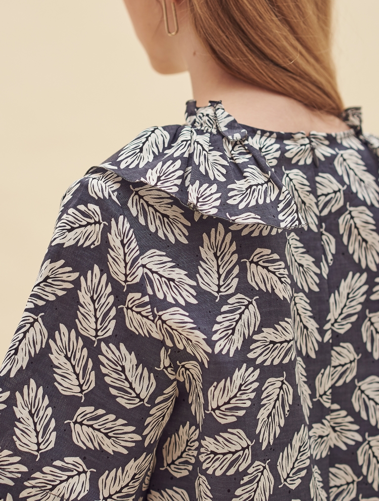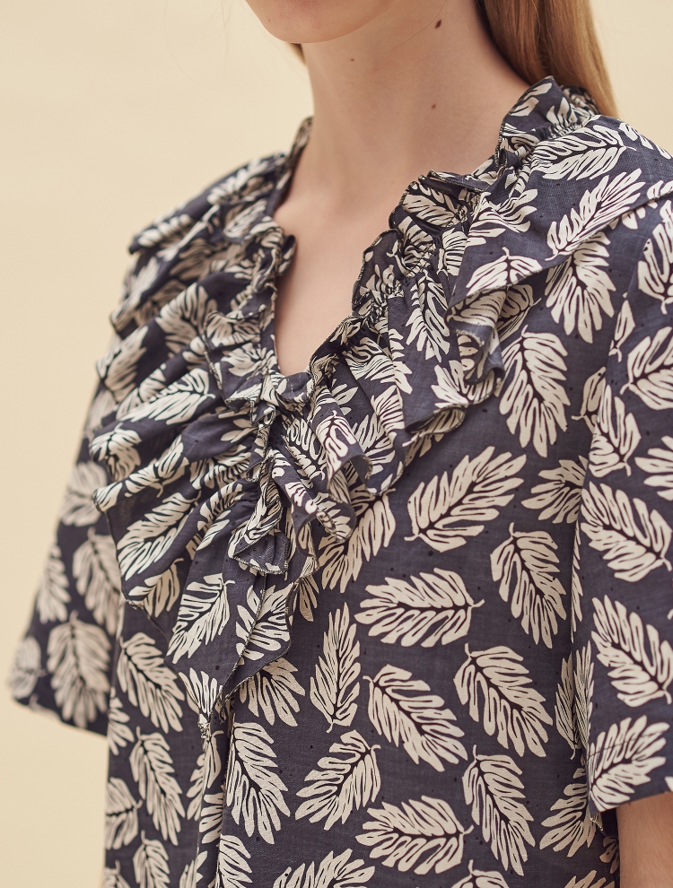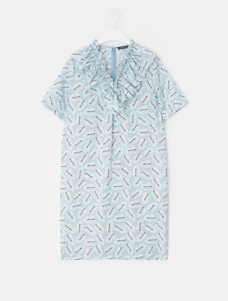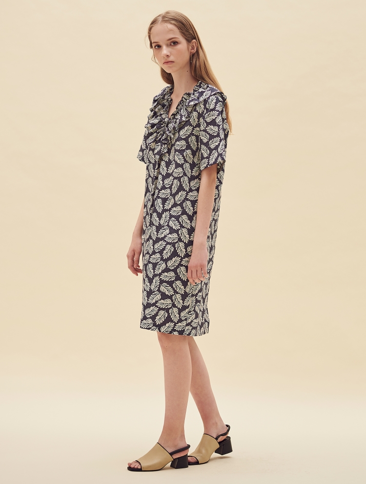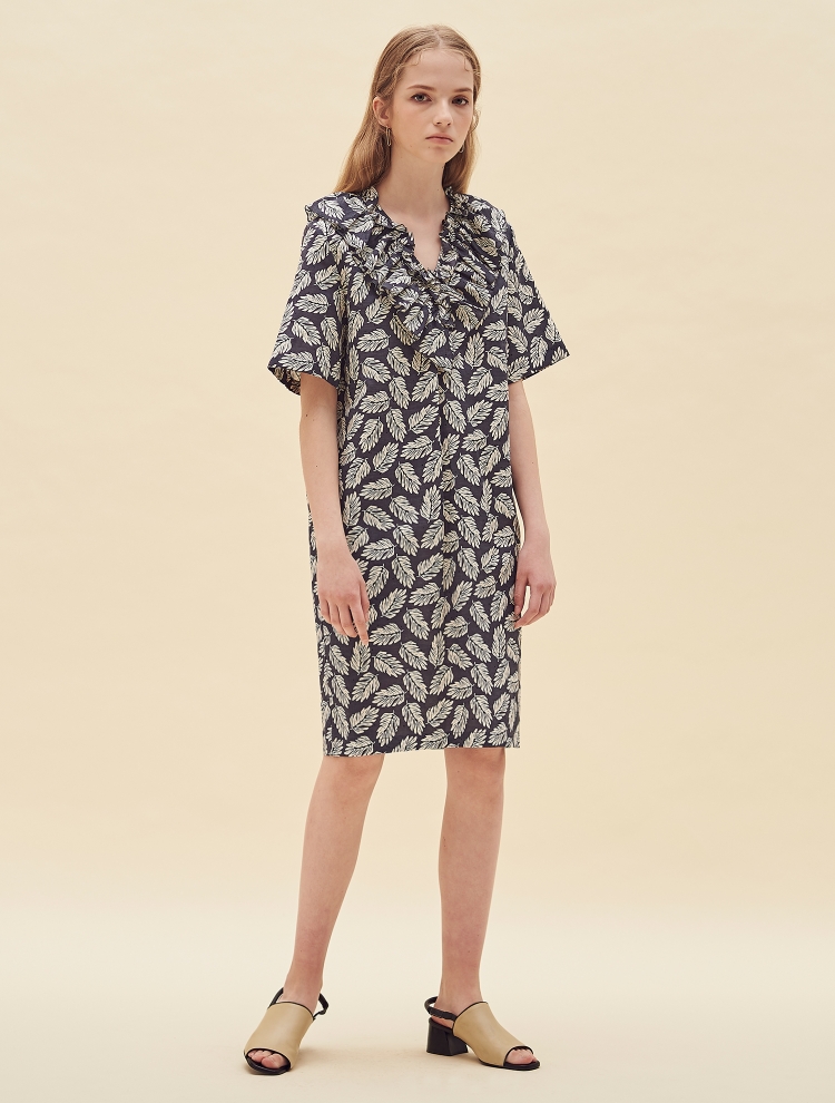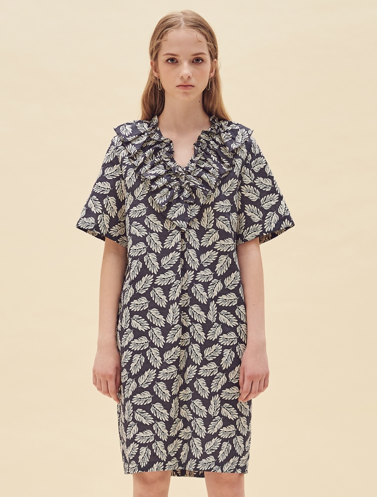 - 전면의 브이컷의 네크라인을 따라 프릴 디테일이 커버되어 있으며 여유있는 실루엣으로 편하게 착용할 수 있는 원피스입니다.