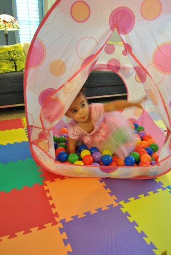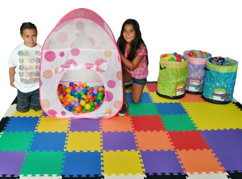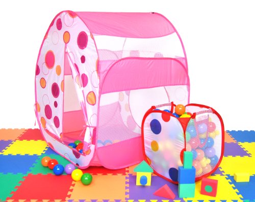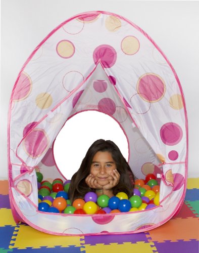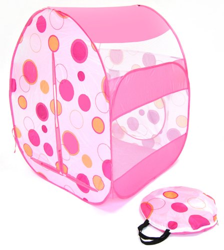 - Feature : Pink polka dot theme play twist tent w/ tote bag! Play balls, mats & hampers not included. / Meshing for child play visibility. Two opening options; front and back side opening. / Dimensions: 31 x 31 x 40 inches / Set up a playground in seconds with its twist technology. The perfect gift for any child. / We recommend 200 of our play balls.