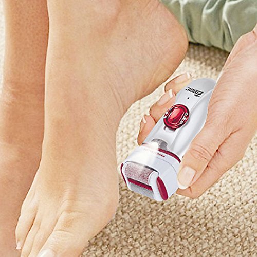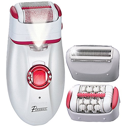 Groomer includes shaver, epilator, and callus-remover heads to remove unwanted body hair, and soften skin on the heels and feet.