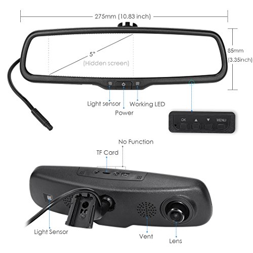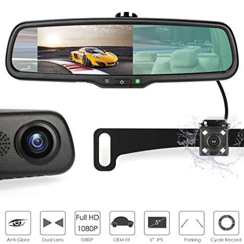 5 inch 1080P Rear View Mirror Dash Camera Video Recorder Parking Monitor for Car with License Plate Backup Camera Dual Lens Auto-Dimming Waterproof 170 Degrees Night Vision