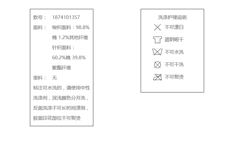 梭织面料:98.8%棉 1.2%其他纤维 针织面料: 60.2%棉 39.8%聚酯纤维