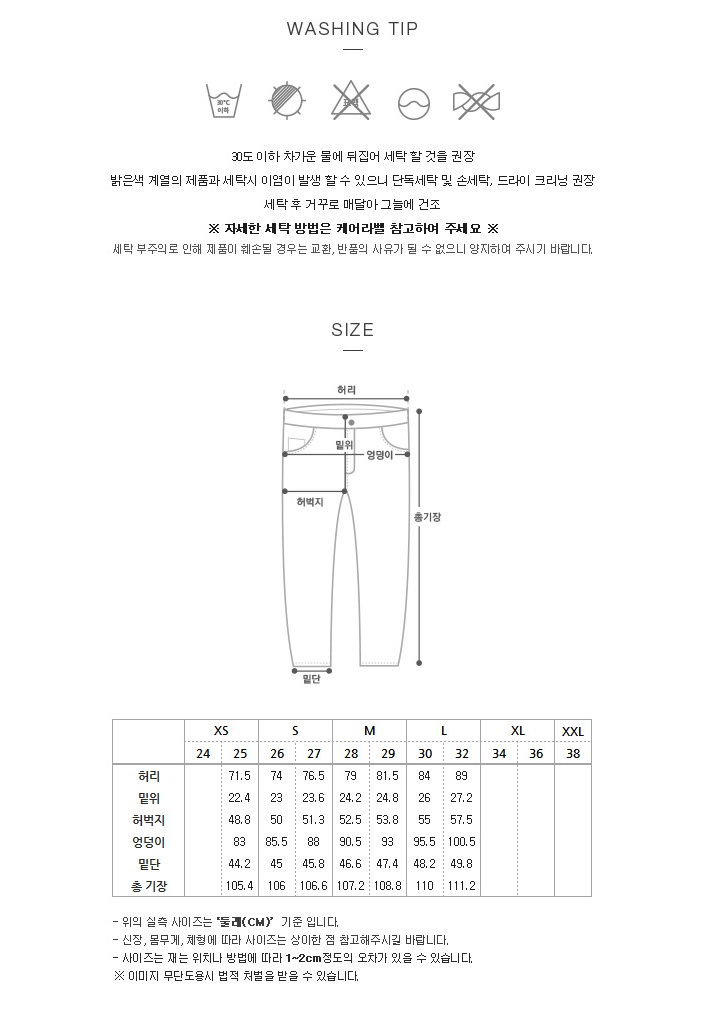 | 되도록 드라이 크리닝 하십시오. 손세탁시 뒤집어 단독세탁 하십시오. 착장시 가방류나 밝은 색상의 의류에 이염 될 수 있으니 주의 하십시오. 반드시 단독 손세탁 또는 드라이 하십시오. 세탁시 탈색의 우려가 있으므로 단독 세탁하십시오. 품질 경영 촉진법에 의한 품질 표시를 꼭 참조하시어 세탁하십시오. 합성세제 세탁시 손상 및 탈색의 우려가 있으므로 미지근한 물에 중성세제로 세탁하십시오. 절대 염소계 표백제로 표백할 수 없습니다. 땀에 젖었을 경우 즉시 세탁하십시오. 심하게 비비거나 비틀어 짜지 마십시오. 물에 10분이상 담가두지 마십시오. 취급부주의로 인한 탈색 및 오염 등 제품의 형태 변질 및 수축된 제품은 보상이 불가능 하오니 주의 하십시요. 취급표시대로 세탁하지 않을시에는 보상받으실수 없습니다. |