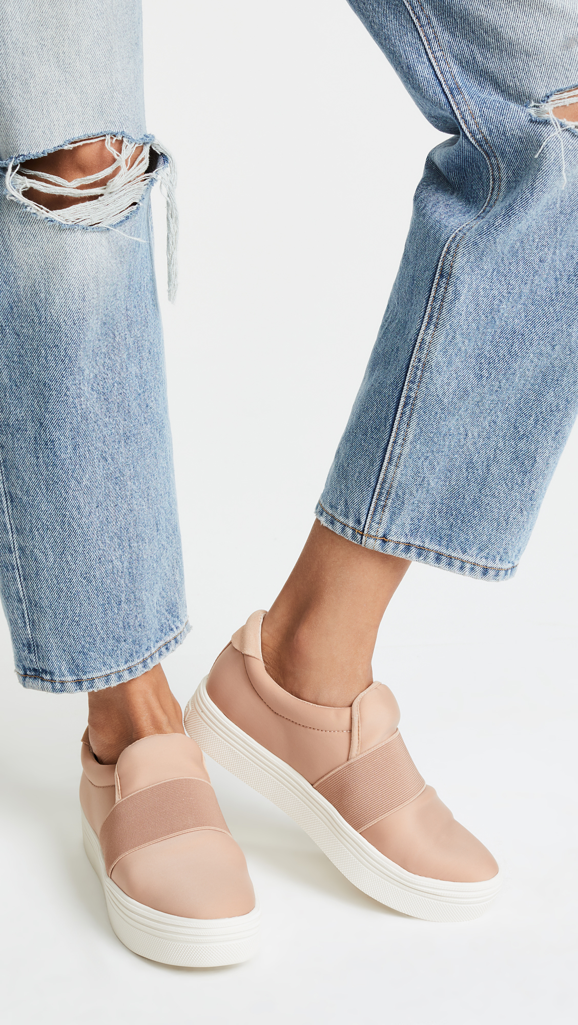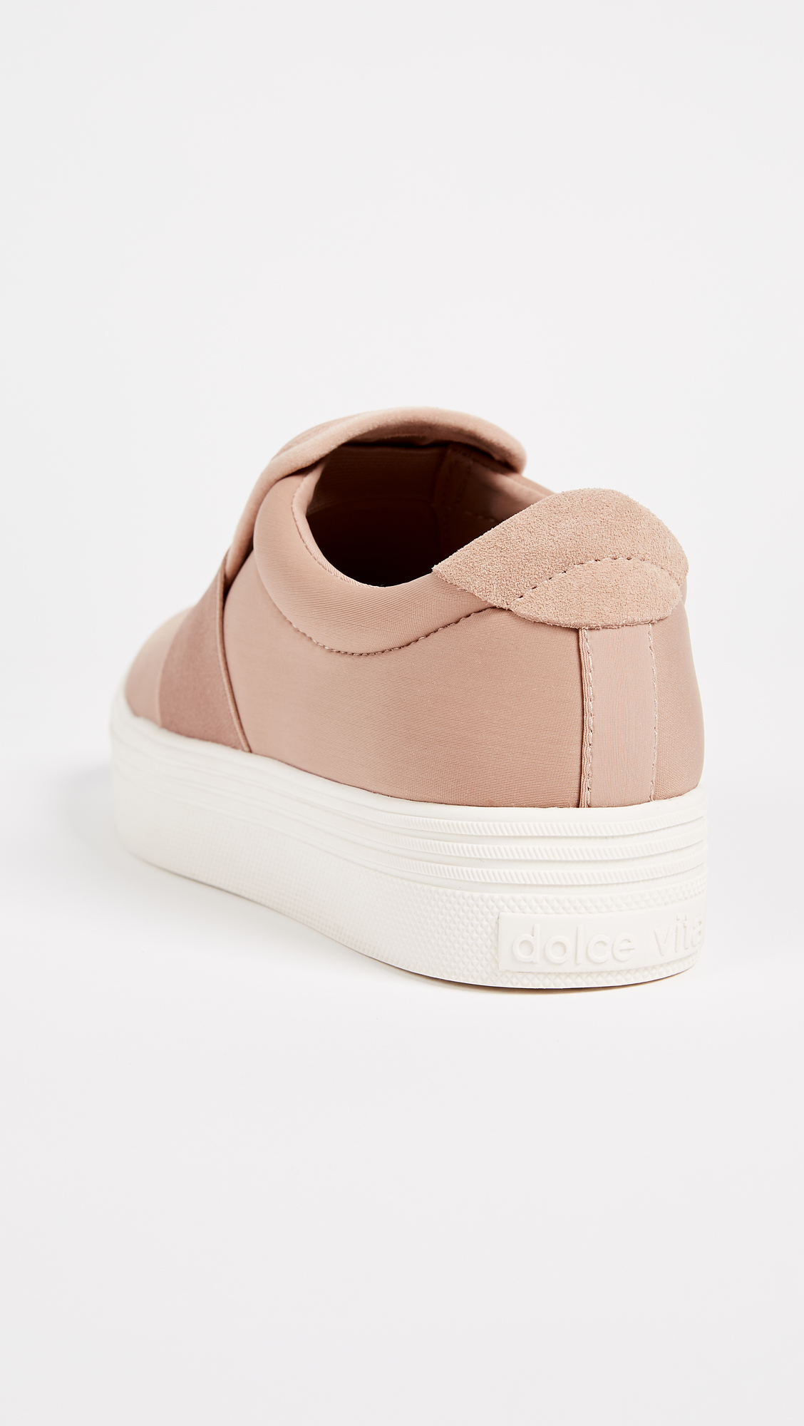 Pale neoprene Dolce Vita slip-on sneakers with elastic straps layering over the top line. Padded collar with suede heel cap. Padded insole. Rubber sole.