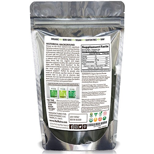 Organic Spirulina Powder by Natural Nutra Our Organic Spirulina Powder is a natural, powerful superfood that contains an abundance of readily absorbable vitamins, such as Vitamins A and B-12, Beta Carotene, calcium, iron and protein that provide high nutritional value and promote natural energy production! Spirulina is known as the most nutrient dense food on Earth because of its high concentration of pure protein, vitamins and chlorophyll, which helps to enhance the immune system and improves digestive health. Why Try Our Organic Spirulina Powder? - High Concentration of Protein, Vitamins and Chlorophyll - Increases Natural Energy Production - Powerful Antioxidant Anti-Inflammatory - Supports Immune Digestive System Health - Enhances Metabolism - Certified for High Quality, Purity Potency - 30-Day, 100% Money-Back Guarantee Here's Why Our Superfoods Are Best in Class: - Made in the USA - NSF Certified Good Manufacturing Practices (GMP) Facility - Registered with the Natural Products Association (NPA) - Certified USDA Organic through EcoCert - Certified Vegan, Vegetarian, Non-GMO, Gluten Free and RawOur Commitment We donate a portion of our sales to the Vitamin Angels Foundation who provide nutritional support for mothers and children in at-risk populations, and support the Green Initiative, which promotes recycling, less waste generation, and eco-friendly community education. As Your Satisfaction Is Important to Us, We Offer All Customers a 30-Day Money-Back Guarantee!**Supply is limited. Order today to ensure availability!** Order Your Organic Spirulina Powder by Natural Nutra Today! 0 |