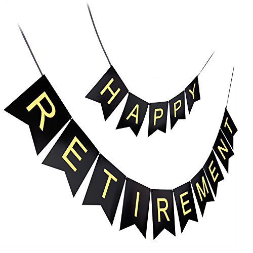 -. Feature : Retirement is a big milestone, our Happy Retirement banner will make your retiree smile. / 15 Swallowtail banners with single letters that spell the phrase "HAPPY RETIREMENT ", 2 separate black beautiful satin ribbons strands, one says "HAPPY" , the other " RETIREMENT ". / Material: high quality cardstock is sturdy and meant to be reused. Size: approx 16 * 20 cm / 6.3 * 7.9 inches, the distance of the banners can be adjusted freely. / The banner with plenty of extra ribbon for easy hanging on the wall, above the table, in the hallway and on the tree, etc. / The banner comes in it's own resealable plastic bag, perfect for storage.