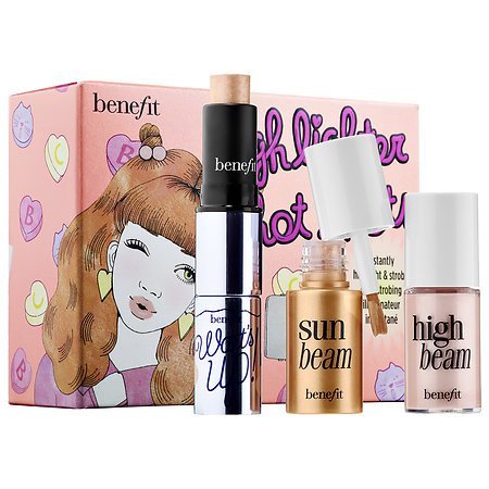 What it is: A limited-edition trio of mini Benefit's bestselling highlighters. What it does: Instantly highlight and strobe your cheeks and brow bones with this set of three top-selling highlighters. Use them as spot highlighters over makeup or underneath makeup for a subtle glow. This set features mini sizes of the High Beam Satiny Pink Liquid Highlighter, Sun Beam Golden Bronze Liquid Highlighter, and Watt's Up Champagne Cream-to-Powder Highlighter. This set contains: - 0.13 oz/ 4 mL Sun Beam - 0.08 oz/ 2.5 g Watt's Up - 0.13 oz/ 4 mL High Beam Beauty tip: Turn up the glow. Layer the highlighters to boost your radiance.