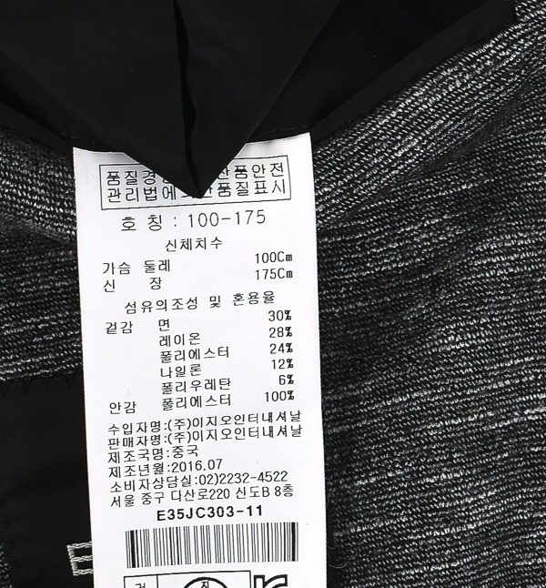 소재 : 면30%레이온28%폴리에스터24%나일론12%폴리우레탄6% 안감:폴리에스터100%?