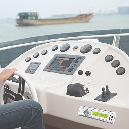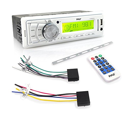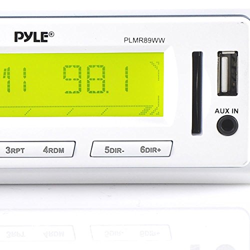 The Pyle PLMR89WW marine stereo radio headunit receiver features versatile media playback capability. The single DIN universal standard comes loaded with features like AM/FM radio with 30 presets, USB flash drive reader, SD memory card reader and Aux (3.5mm) input connector jack. You'll have the ability to connect and stream audio from all of your favorite devices (smartphones, tablets, MP3 players, etc.). Digital audio file support allows you to stream your MP3 files -- while you have quick access to the front panel control center and digital LCD display screen. The system also features Weather-Band functionality for real-time weather alert condition updates. Control it all with the included wireless remote control. Add convenient and versatile audio playback ability with the Pyle PLMR89WW stereo radio headunit receiver system.Feature