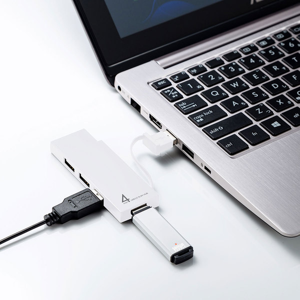 ●USBケーブルを本体に収納でき、持ち運びにも便利な4ポートUSB2.0ハブです。