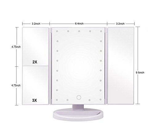 TRI-FOLD VANITY MIRROR - 3 PANELS Provide Wide Angle Viewing AND 1X/2X/3X magnification used together to make perfect makeup - offers crisp reflection - Clear, distortion - free reflection shows you exactly what you need to see. Save tears of frustration when eyelining, tweezing, applying mascara, flossing, putting in contacts, theatrical makeup, and face painting. Or use mirror