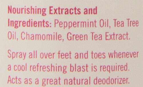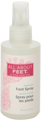 - Feature : Purse size 4.2 ounce bottle of cooling foot spray with peppermint oil / Cooling combination of Menthol, Peppermint Oil and Spearmint for a cooling zing plus Tea Tree Oil for its antibacterial properties / Free from parabens, synthetic dyes, mineral oils, SLS and phthalates / All About Feet is serious foot care to treat over-worked feet with the uplifting and energizing minty sweet scent / Upper Canada Soap products are never tested on animals