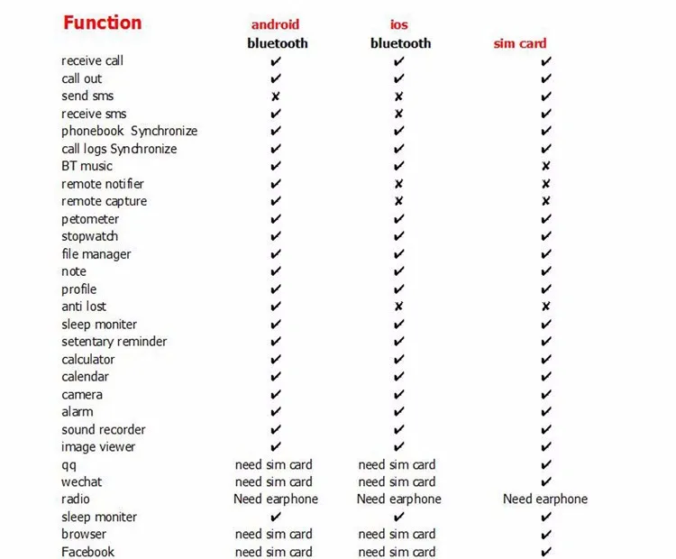 Function:Answer Call,Dial Call,Alarm Clock,Push Message,Passometer,Message Reminder,Sleep Tracker,Call Reminder,Fitness Tracker