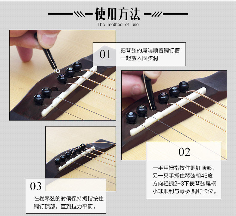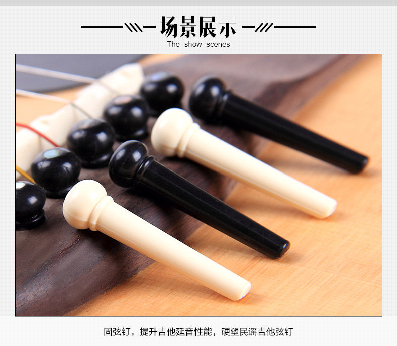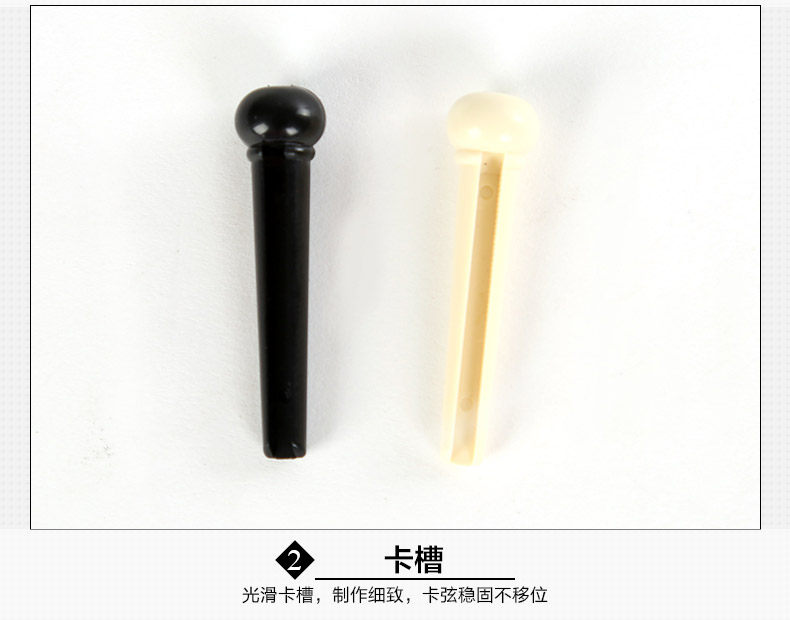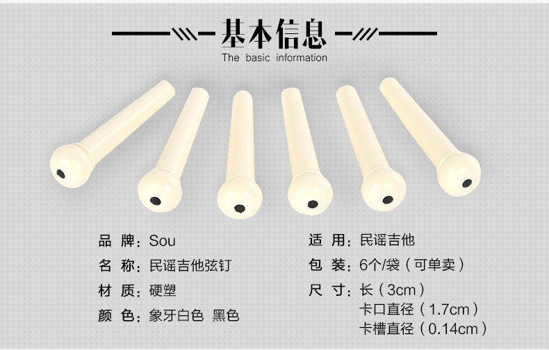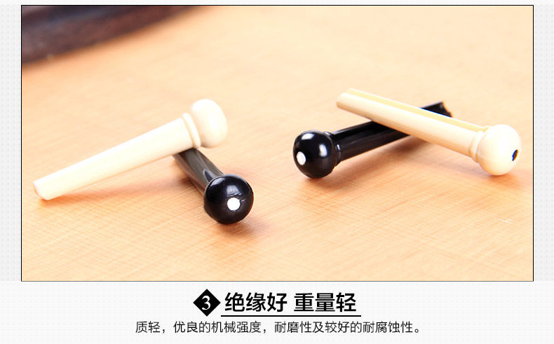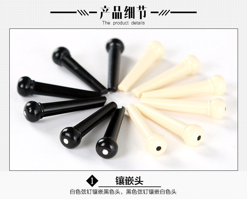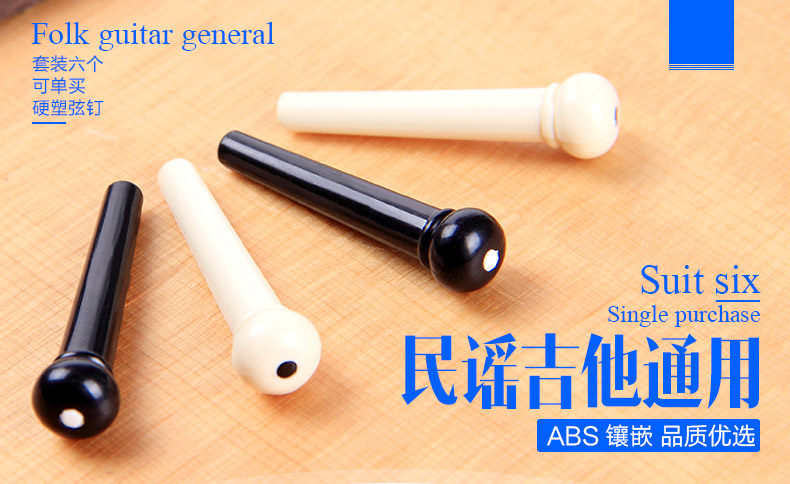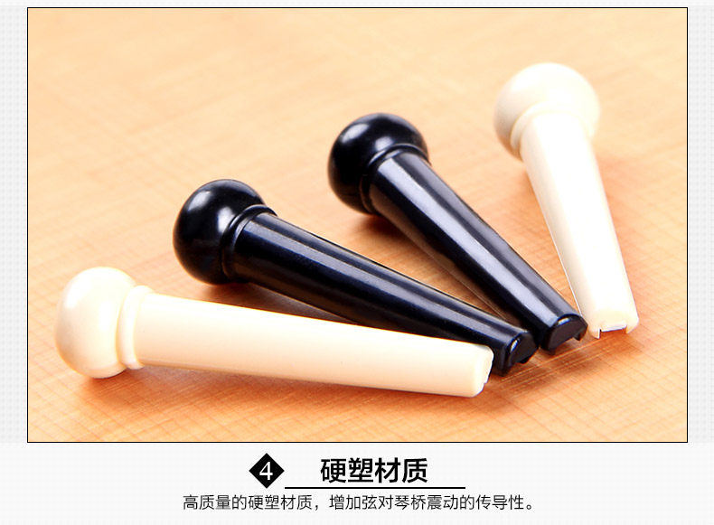 Precision molded from high quality PVC plastic,regular size acoustic guitar bridge pins. Offers more strength and durability than general plastic bridge pins. Dimensions 1.26 in x 0.31 in x 0.31 in (3 cm x 0.8 cm x 0.8 cm) what in the box: 6 pcs of guitar pin Quality: TOP! sustain up to 8 second! Color: Black / White Model: LD-0258