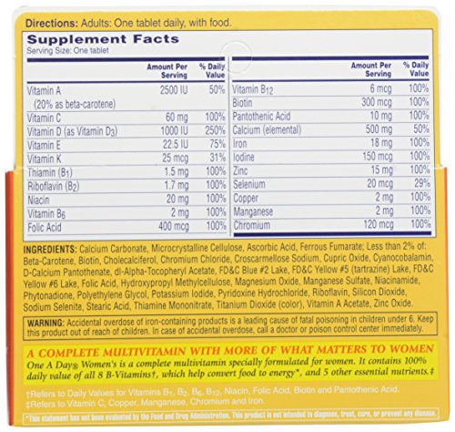-. Feature : One a day women's multivitamin 100ct / Supplies 100% daily value of 10 essential vitamins and minerals / Vitamin A levels scientifically-formulated to keep bones strong / Includes magnesium, calcium, and vitamin D; high in iron / Please read all label information on delivery