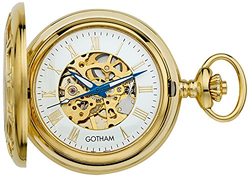-. Binding : Watch -. Brand : Gotham -. Department : Mens -. Feature : Classic and elegant gold-tone Roman numeral design exhibition covered pocket watch / Intricately designed front cover opens to expose beautiful white Roman numeral dial with gold tone exhibition center to display movement and it's moving parts / Elegant blue cobalt hour, minute and seconds hands plus raised gold tone Roman numerals / Includes matching 14" curb pocket watch chain with spring ring attachment / Arrives with deluxe draw string pouch and gift box, Selvyt polishing cloth, operating instructions and lifetime limited warranty card -. Label : Gotham -. Manufacturer : Gotham -. Model : GWC14091G -. MPN : GWC14091G -. PackageQuantity : 1 -. PartNumber : GWC14091G -. ProductGroup : Watch -. ProductTypeName : WATCH -. Publisher : Gotham -. Studio : Gotham -. Title : Gotham Men's Gold-Tone 17 Jewel Mechanical Covered Pocket Watch # GWC14091G