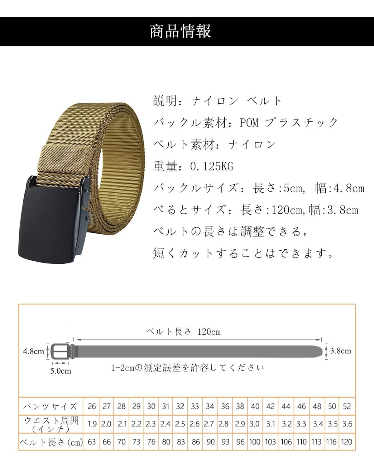 素材:ナイロン+YKKバックル。重量:110g。バックルサイズ:長さ5.0cm幅4.8cm。ベルト長さ:125cm。ヒント:ベルトの長さは調整できる,さらに短くカットすることはできます。