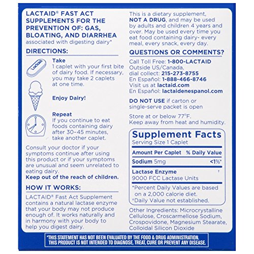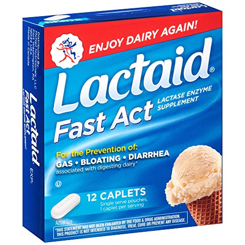 Lactaid Fast Act Caplets work naturally to make dairy foods easy to digest, if you have lactose intolerance, so you can enjoy everything on your plate. They help prevent the gas, bloating, and diarrhea that many people experience after eating foods containing dairy. With the natural lactase enzyme, this dietary supplement helps prevent symptoms associated with lactose intolerance by breaking down milk sugar (lactose), so dairy foods are easier to digest. These easy-to-swallow caplets start working with your first bite or sip of dairy food. Certified kosher and suitable for ages four and up, this package of Lactaid Fast Act Caplets contains 12 single-dose pouches.Feature