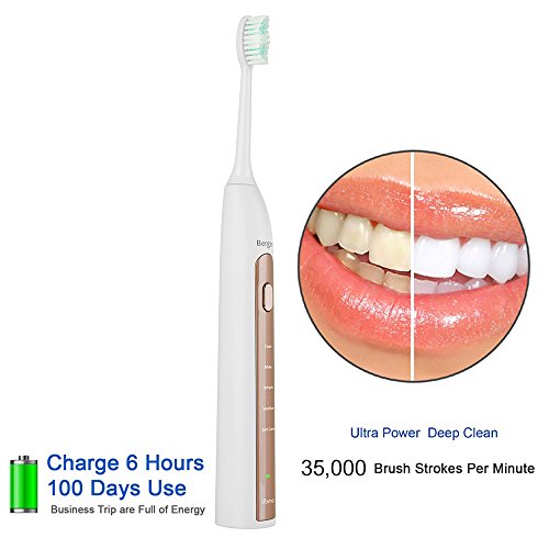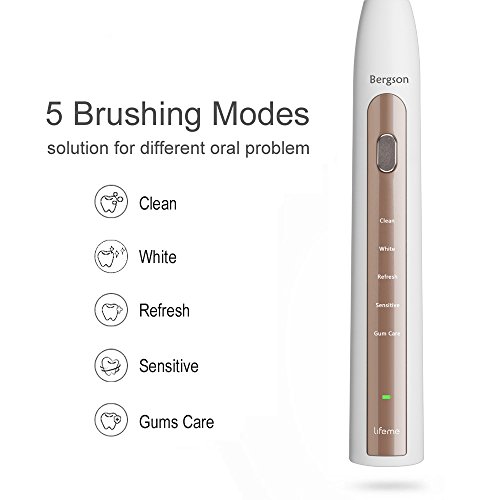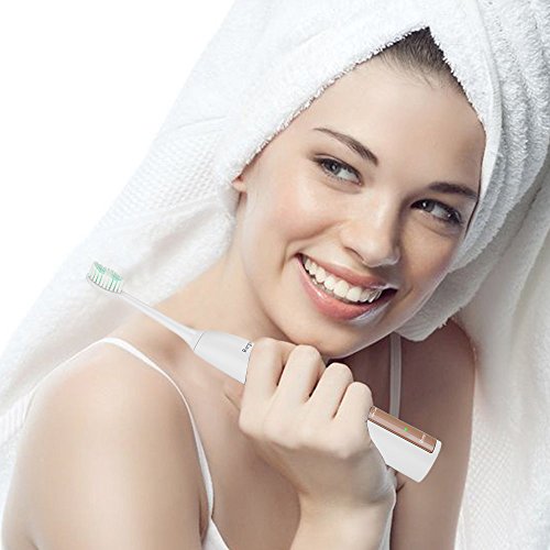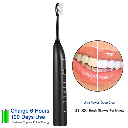 -. Feature : 4 Brush heads, 5 different cleaning modes available: Clean, Refresh, Whitening, Gum Care and Sensitive,Meet the Different Needs of Teeth Protection. / Superior Dental Hygiene Modes -Clean, Refresh, White, Gum Care,Sensitive ;Smartimer encourages 2 minutes with a reminder every 30 seconds of brushing as recommended by dentists. / Highest Capacity Rechargeable Sonic Electric Toothbrush--Charge 6 Hours Last 100 Days Used!!! / IPX68 Class Waterproof-allows you to use the toothbrush when showering. / Powerful sonicare toothbrush- with up to 31,000VPM brush strokes per minute,removes up to 99.99% of plaque along gum line for your teeth.