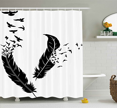 Animal Decor Shower Curtain by Ambesonne, Illustration of Feathers and Scattering Birds Decorations for Home Print, Fabric Bathroom Decor Set with Hooks, 75 Inches Long, Black and White
