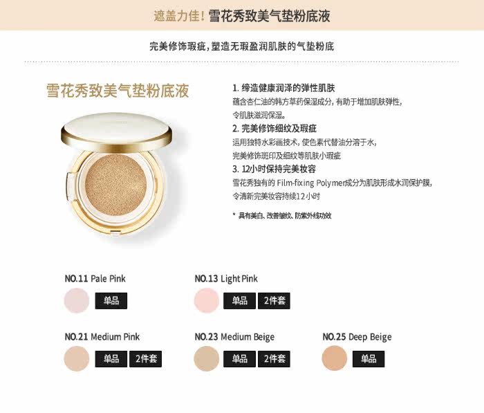 15年新推出雪花秀致美润白气垫粉饼,珍珠母复合物和木莲提取物,可使失去生气的肌肤展现靓丽光彩,全面提高皮肤亮度,使肌肤更加明亮,透彻。