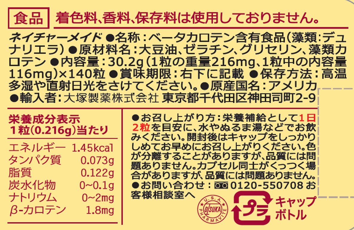 栄養成分 : 1粒(0.216g)当たりエネルギー/1.45kcal、タンパク質/0.073g、脂質/0.122g、炭水化物/0〜0.1g、 ナトリウム/0〜2mg、β-カロテン/1.8mg