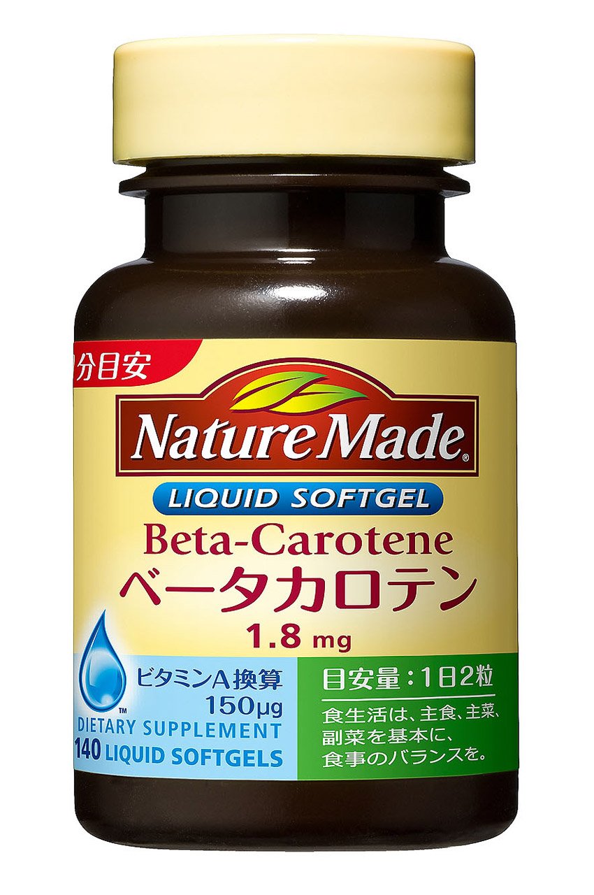 ■トマト2個分のベータカロチンが一粒に! 厚生労働省では、野菜を1日当たり300g摂取することを勧めていますが、そのうち100gを“緑黄色野菜”から摂ることが大切であるとしています。緑黄色野菜といえば、文字通り緑や黄色などの色鮮やかな野菜を思い浮かべます。しかし、これとは違って緑黄色野菜の定義は、それに含まれる“ベータカロチンの量”で決められています。(厚生労働省の分類では、“新鮮な野菜100g中にベータカロチンを600μg 以上含有するもの”を緑黄色野菜とし、その他の野菜と区別しています。) つまり、緑黄色野菜に多く含まれているベータカロチンが、私たちのカラダにとても重要ということなのです。胃腸で吸収されたベータカロチンは、肝臓に蓄えられ、必要なときに必要な分だけビタミンAに変わって目や組織の粘膜などに運ばれます。そして、皮膚や粘膜の健康維持を助けたり、夜間の視力の維持を助けたりしてくれます。 さらに、ベータカロチンには過剰症の心配がありません。吸収率が低く不足しやすい栄養素ですので、しっかりと摂ってカラダに栄養を送りましょう。 ネイチャーメイド・ベータカロチン2粒当たりのベータカロチン含有量3.6mg(3,600μg) ≒トマト 中4個分