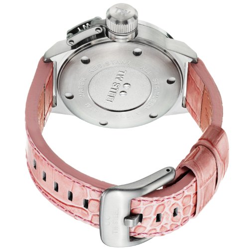 Stainless steel case with a pink leather strap. Fixed silver-tone bezel set with 56 Swarovski crystals. White dial with black hands and index hour markers. Arabic numerals mark the 3, 6, 9 and 12 o'clock positions. Minute markers around the outer rim. Dial Type: Analog. Date display at the 3 o'clock position. Quartz movement. Scratch resistant mineral crystal. Pull / push crown with canteen cover. Solid case back. Case diameter: 45 mm. Case thickness: 12 mm. Round case shape. Band width: 20 mm. Band length: 8 inches. Tang clasp. Water resistant at 100 meters / 330 feet. Functions: date, hour, minute, second. Casual watch style. TW Steel Canteen 45mm White Dial Crystal-set Bezel Pink Leather Ladies Watch STW36