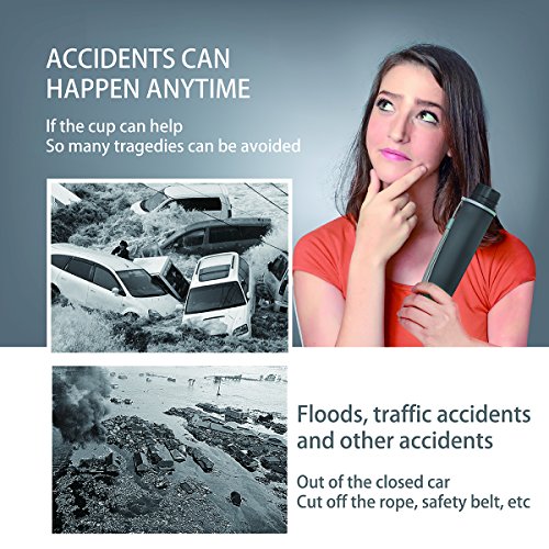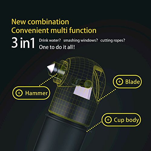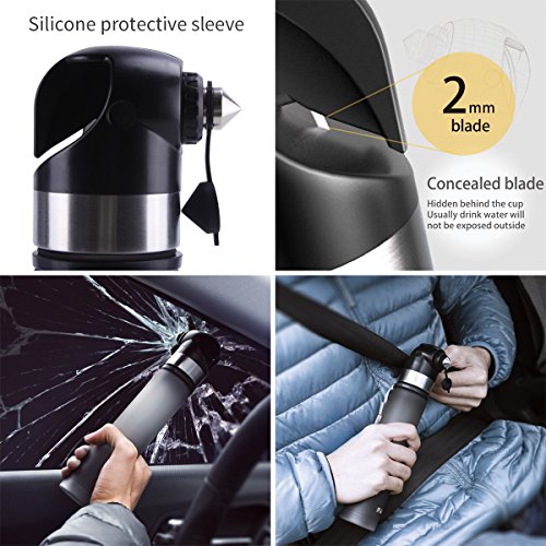 - The bottle lid inner has leak proof silicone pad, metal wire drawing material.And the lid has two functions: there is a high quality stainless steel hammer, which can break the 10mm thickness window. The hammer has a silica gel cover, protect it and prevent hurt when you use the bottle. Another one is cup lid with stainless steel cutter, which can cut safety belt, but hidden in the rear lid and doesn't exposed when you used.So when you in danger, you can use them when you in emergency.