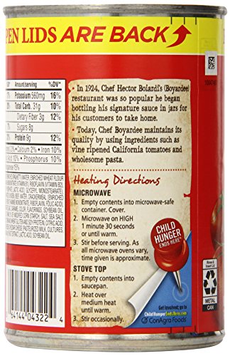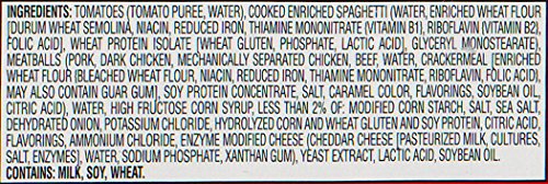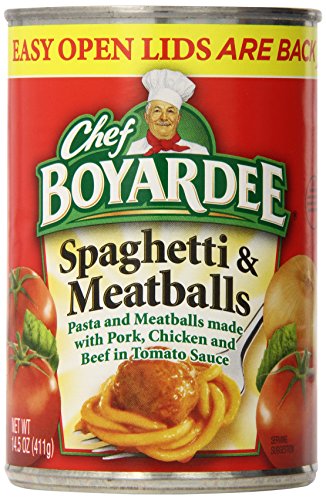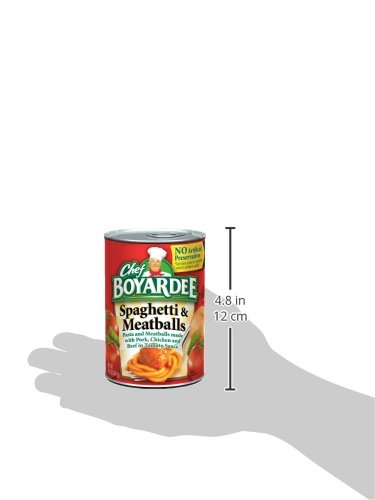 -. Binding : Grocery -. Brand : Chef Boyardee -. Feature : Chef Boyardee spaghetti and meatballs is pasta and meatballs made with pork, Chicken and Beef in tomato sauce / 1/2 cup of vegetables per serving / Good source of 7 vitamins and minerals / Good source of protein -. Label : Chef Boyardee -. Manufacturer : Chef Boyardee -. MPN : 6995263 -. NumberOfItems : 24 -. PackageQuantity : 24 -. PartNumber : 6995263 -. ProductGroup : Grocery -. ProductTypeName : GROCERY -. PublicationDate : 2013-06-29 -. Publisher : Chef Boyardee -. ReleaseDate : 2013-06-28 -. Size : 14.5 Ounce -. Studio : Chef Boyardee -. Title : Chef Boyardee Spaghetti and Meatballs, 14.5 Ounce (Pack of 24)