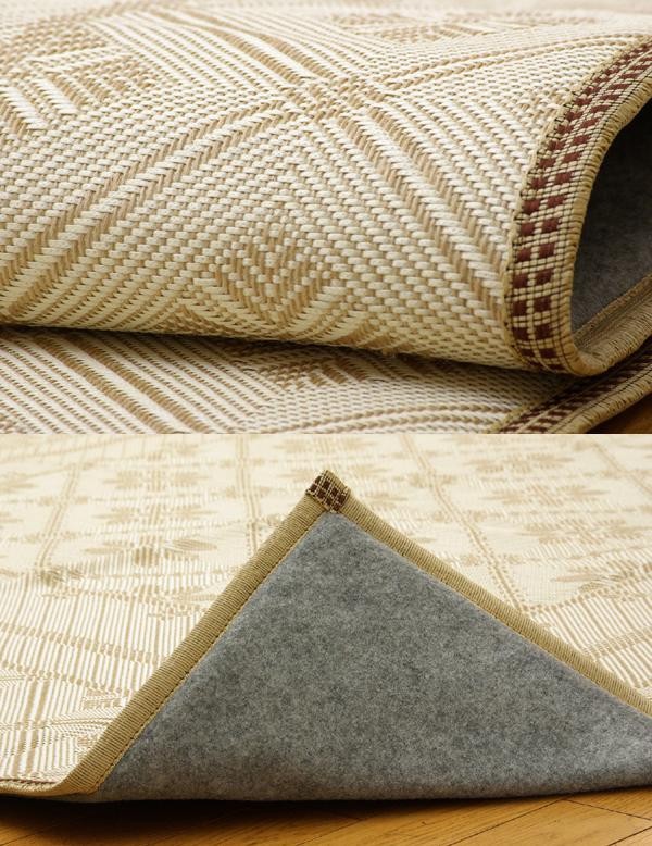 麻の一種であるジュート糸と、ポリエチレン糸のジャガード織のカーペットです。裏面にはフローリングを傷つけにくいよう不織布を貼っています。また、中材にはウレタンを使用しているのでクッション性があります。 |