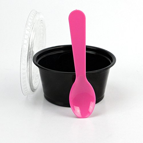 Disposable Black 2oz Plastic Condiment Cups with Lids and 3" Sampling Spoons, Souffle Portion, Jello Shot Cups, Dessert, Sample Cups (100 Count, Pink Tasting Spoons)