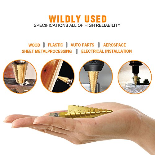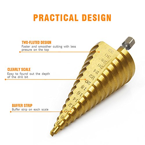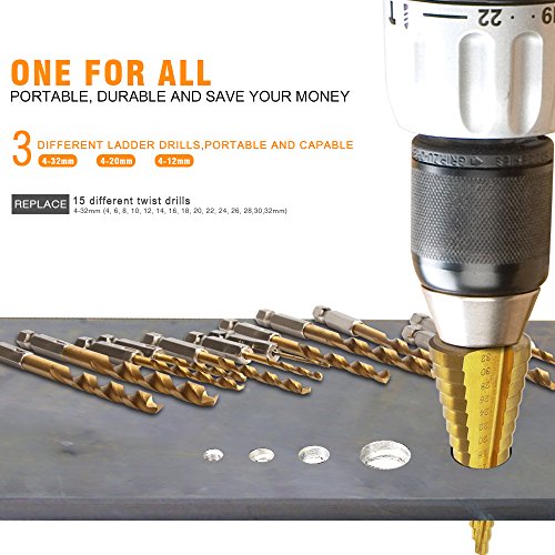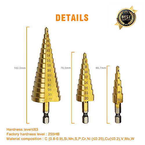 Xilko 3Pcs High-Speed Steel Step Drill Bit Set Power Tools Cone Titanium Coated Metal Hole Cutter 1/4" Hex Shank Drive Quick Change 4-12mm/4-20mm/4-32mm