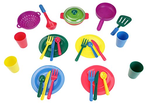 -. Feature : Great gift for your loved kids / Kids Play Kitchen Set for age 3+ / Safe material Kitchen Toy Set, BPA and phthalates free / 26 pieces Kids Play Kitchen Accessories: 4 Saucers - 4 Cups - 4 Knifes - 4 Spoons - 4 Forks - 3 Pans - 1 soup ladle - 1 Turner -1 Dish drainer / Pretend Play Kitchen Set, helps children to develop hand-eye coordination, sharing and communication skills, table manners, imaginative and expressive play skills