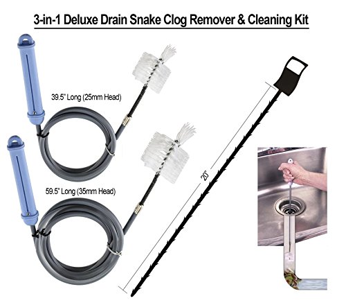 Riptide 3-in-1 Deluxe Drain Snake Cleaning Clog and Grime Removing Kit with Two Durable Brush Head Snakes and One Barbed Clog-removing snake