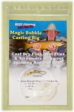 -. Feature : The strongest Butyrate Plastic Bubbles made in the USA! Now you can Cast Flies with your Spinning Rod and Reel! / Contents: 1- Magic Tough Butyrate Plastic Casting Bubble, 1- #7 Brass Snap Swivel, 1- 7.5' 3X Tapered Laeder / Simple set-up instructions included. / We use the highest Quality Components. / Catch More and Larger Fish!