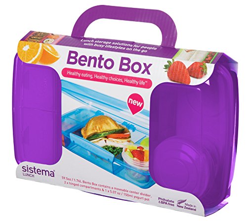 Bento box features 1 moveable center divider, 2 hinged compartments, 1- 5 oz yogurt pot; solid assorted colors; measures 10.8 x 6.9 x 2.95