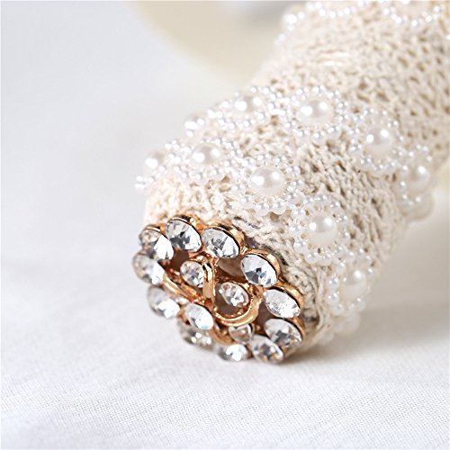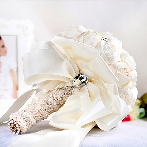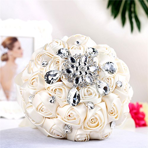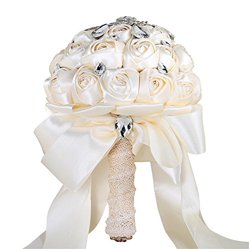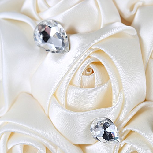 Bridal Wedding Bouquets Bridesmaids Artificial Holding Flowers with Ribbon Roses Crystals Pearls Accents Handmade for Wedding, Party, Church and Home Décor (7.08x10.4 Inches, Ivory)