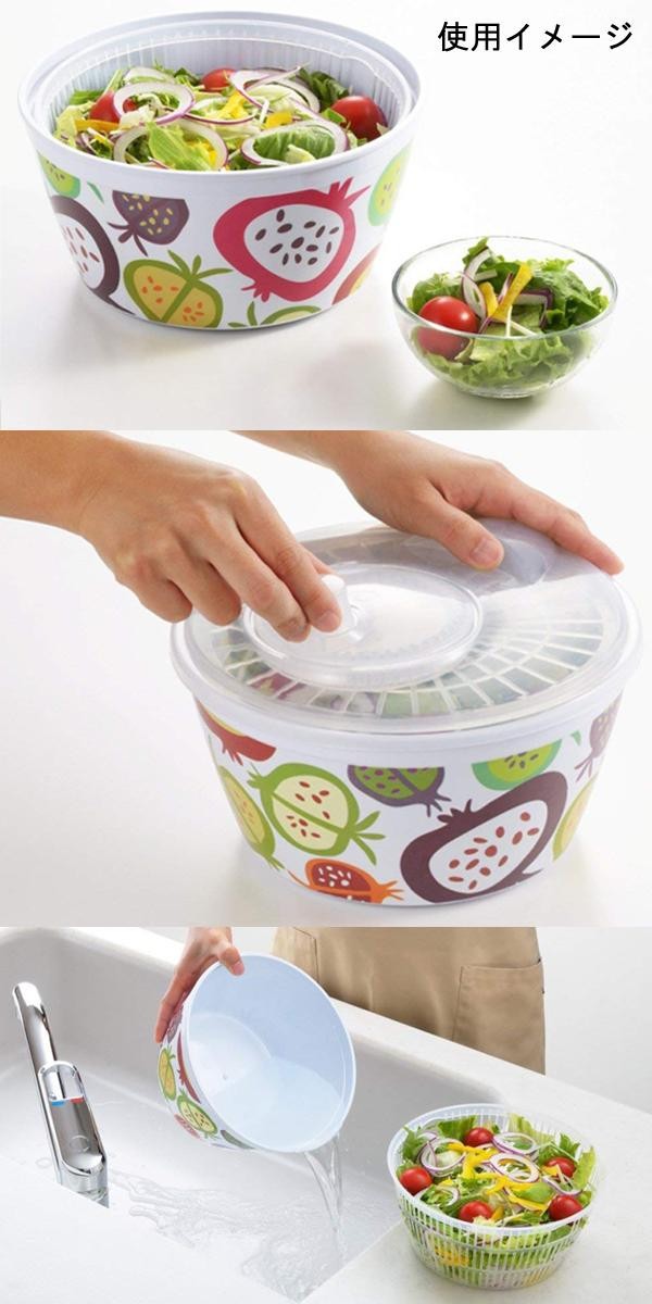 ツマミをくるくる回すだけ。素早く野菜の水切りが出来ます。可愛いフルーツ柄なので、そのままサラダボウルとして食卓にも出すのもオススメです。 |