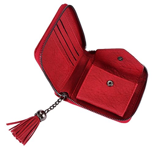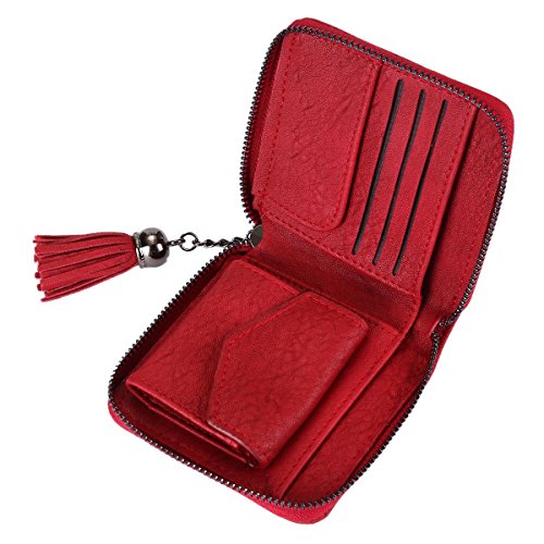 -. Feature : Material:Faux leather / Zipper around closure / Weave design and tassel decoration / 4 card slots ,a snap pocket and 1 bill site inside / Measurement is app 10.5x10x2cm(4.13x3.94x0.79inch) .