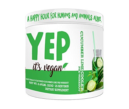 -. Binding : Health and Beauty -. Brand : Yep, it's Vegan -. EAN : 0045995698580 -. Feature : VEGAN PRE-WORKOUT: This is the coolest (pun intended) and most unique Pre-Workout, vegan or not, on the market. It's got 6 types of mushrooms* in it, to help with oxygen utilization. / MORE INGREDIENTS: The other ingredients aren't too shabby either; with enough caffeine to kick you in the rump before you workout. The taste is amazing, it's refreshing and cool. Don't let the color fool you (it kinda looks like beer a little bit bro) because your pie hole is going to be thirsty for this. Very thirsty. / GREAT TASTE: Finally, a vegan Pre-Workout that doesn't suck. And we have it, because we're cool as a cucumber. / AWESOME SAUCE: We love this stuff! You will too after you go Beast-Mode on your workout. / YEP, IT'S VEGAN: Our vegan pre-workout is Lactose-Free and Gluten-Free. Enjoy! -. IsAdultProduct : 0 -. Label : Yep, it's Vegan -. Manufacturer : Yep, it's Vegan -. MPN : YV -. PackageQuantity : 1 -. PartNumber : YV -. ProductGroup : Health and Beauty -. ProductTypeName : HEALTH_PERSONAL_CARE -. Publisher : Yep, it's Vegan -. Studio : Yep, it's Vegan -. Title : Yep, it's Vegan | Vegan Pre-Workout | All-Natural Formula | 25 Servings (Cucumber Lime Cooler) -. UPC : 045995698580