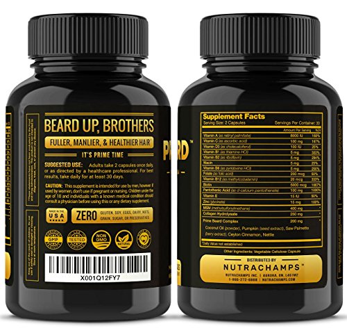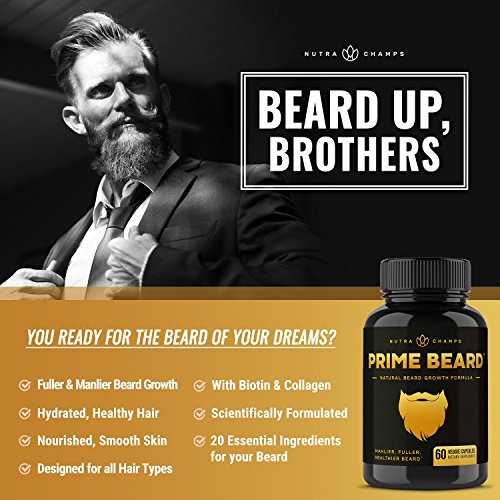 ★ PREMIUM FORMULA, NATURAL INGREDIENTS - Prime Beard is a scientifically designed hair growth supplement that helps you achieve the beard of your dreams. Crafted for all beards, mustaches, goatees, sideburns, and hair on the head, Prime Beard is styled for you. With 20 essential proteins, vitamins, minerals, and herbs for beard & hair health, you'll be going prime in no time.