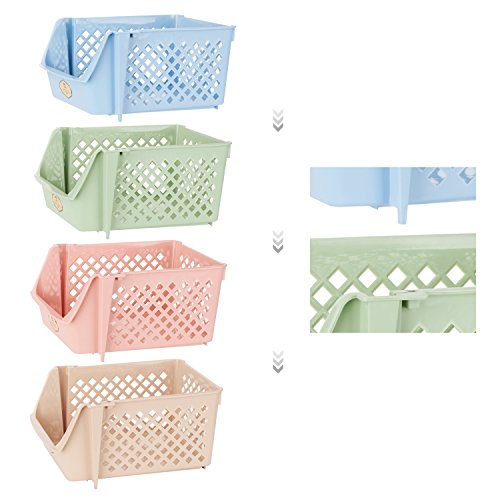Titan Mall Storage Bins Plastic Stackable Storage Bins for Food, Fruits, Files, Mixed Color Storage Baskets, 15 X 10 X 7 Inch/bin, Blue-Green-Pink-Khaki, Set of 4