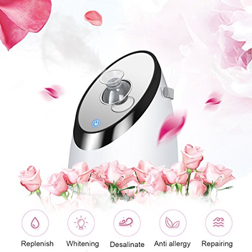-. Feature : SPA-LIKE FACIAL TREATMENT: constructed of ABS; this facial steamer produces nano-sized steam particles that is 10x more effective in penetrating your skin than normal steam, letting you enjoy spa-like facial sauna treatments at home with ease / GIVES YOU A CLEAN, HEALTHY LOOKING SKIN: it turns clean water into micro-fine particles to produce tepid nano-sized mist that opens your pores for easier facial cleansing and makeup removing, moisturizes and softens your skin, melts away dead skin cells to make nutrients more absorbable for the skin / CONVENIENT: the nozzle can rotate 45° up and down to direct the steam to you no matter you are sitting higher or lower; built-in portable handle for easy carrying; built-in front mirror allows you to apply mask easily and assimilate mask essence better after steaming / EASY TO USE: a simple touch switch for turning on/off; only takes 15 seconds to warm up; a 70ml water tank gives you around 15 minutes of steaming and is whisper quiet when working; the tank is see-through so you can see when it runs out of water / YOUR SAFETY FIRST: this steamer has a 70 ml water tank and will automatically shut off when the water runs out to avoid overheating; it is recommended to use 10 minutes each time and maximum of 2 to 3 times per week